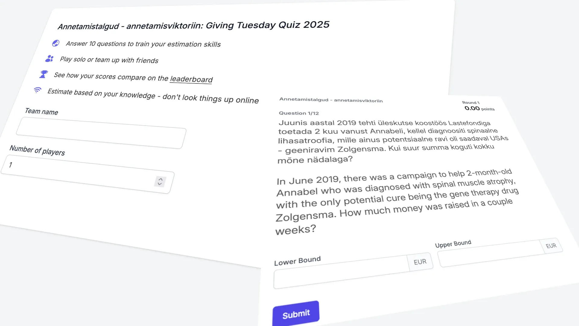 Korraldasime Tartus ja Tallinnas annetamisteemalise viktoriini. Anname võimaluse kaasa mängida ka neile, kes ei jõudnud üritustele tulla või soovivad uuesti mängida.